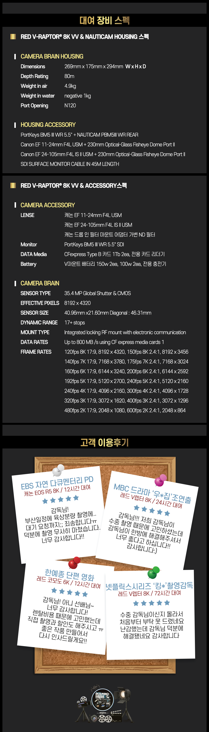 영화, 드라마, 다큐멘터리, 상업 광고, 예술 작품 등 어떤 프로젝트든, RED V랩터 8K + 노티캠 수중 하우징 수중촬영 풀 세트 대여상품은 여러분의 수중 촬영 경험을 극대화하고 차원이 다른 결과물을 선사할 것입니다.