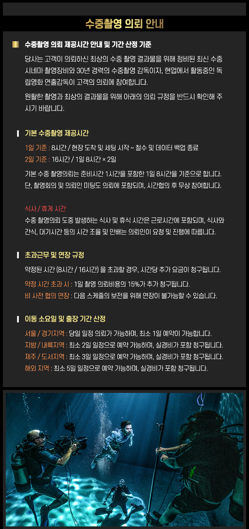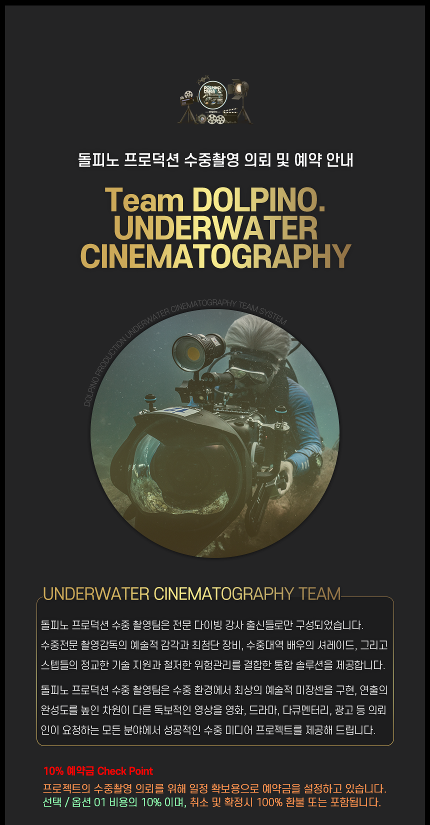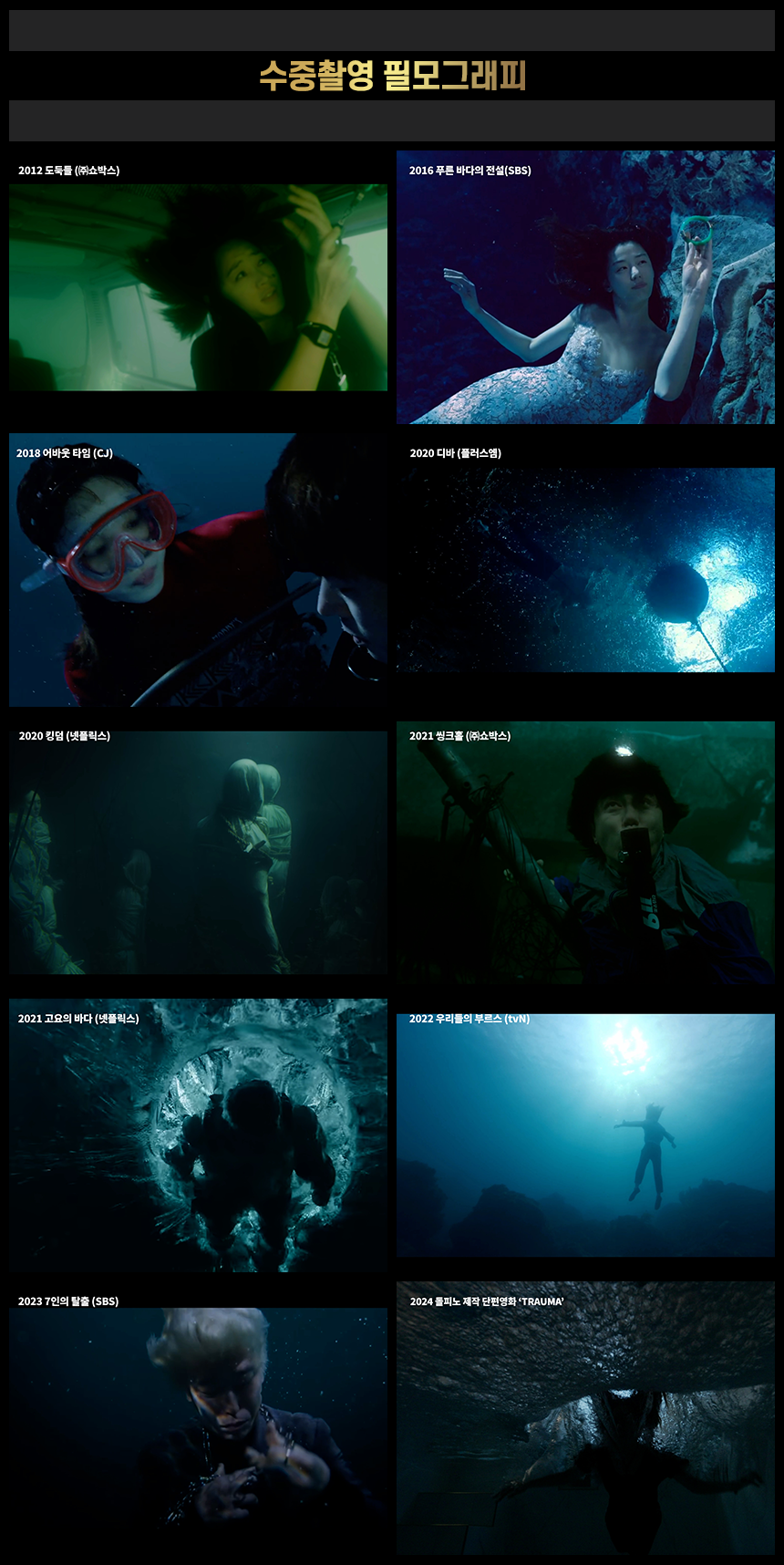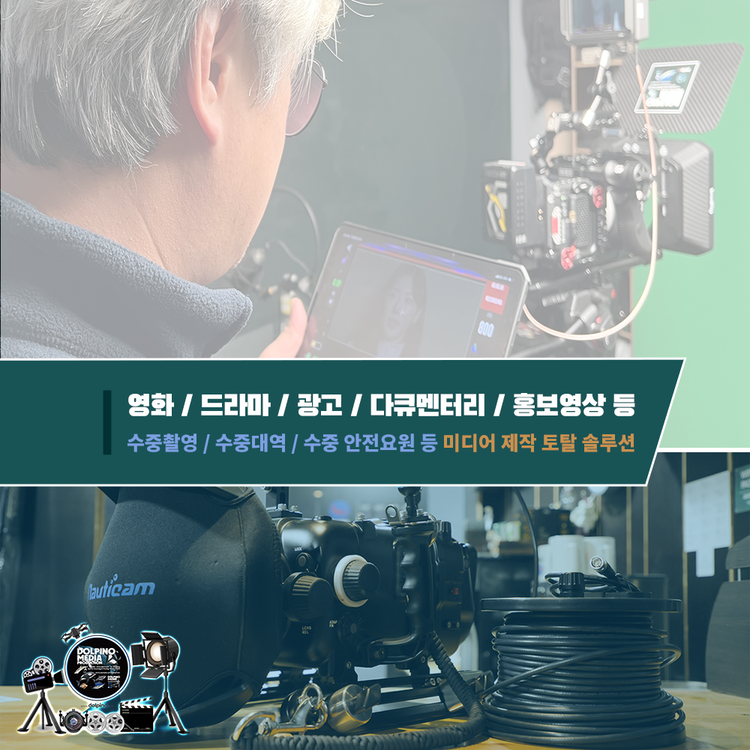 경험 많은 수중 전문 미디어 제작팀의 전문성과 안정적인 운용 능력으로 영화, 드라마, 다큐멘터리, 상업 광고, 예술 작품 등 수중 미디어 프로젝트 의뢰에 대하여 어떤 문제없이 최고 수준의 완성도와 전문성으로 차별화된 수중 미디어 콘텐츠 결과물을 제공해드립니다.