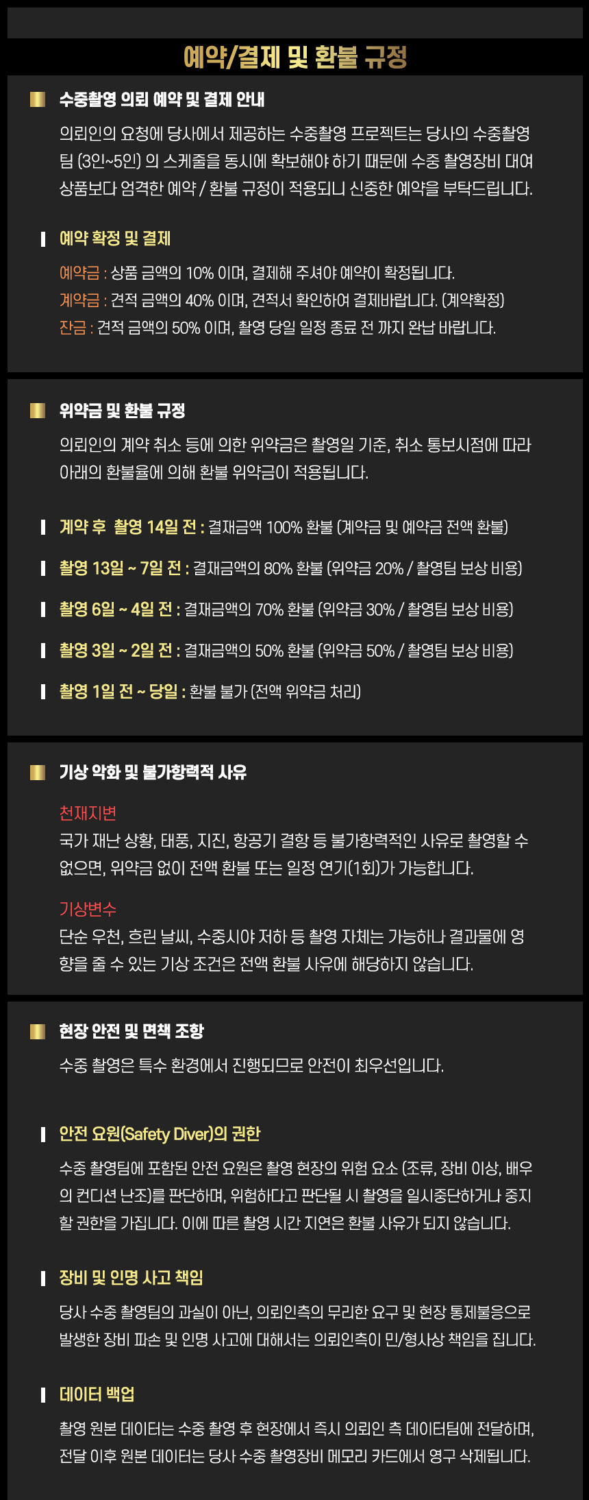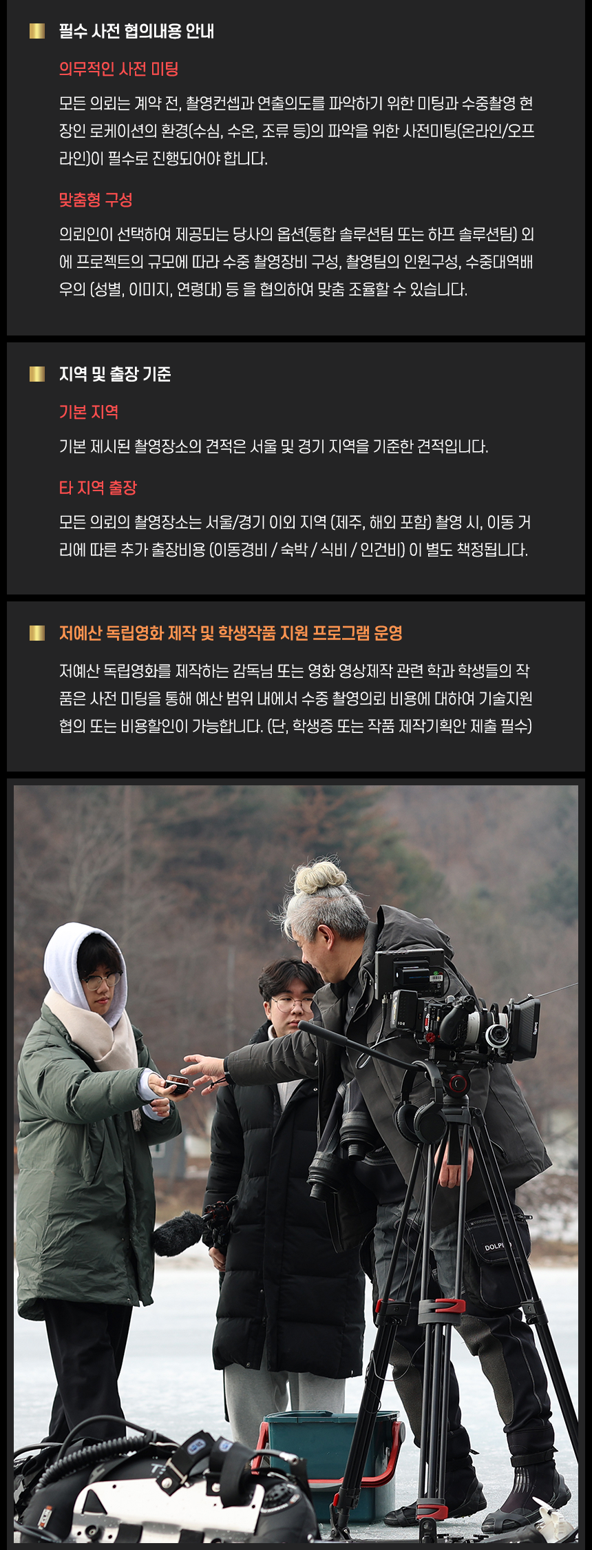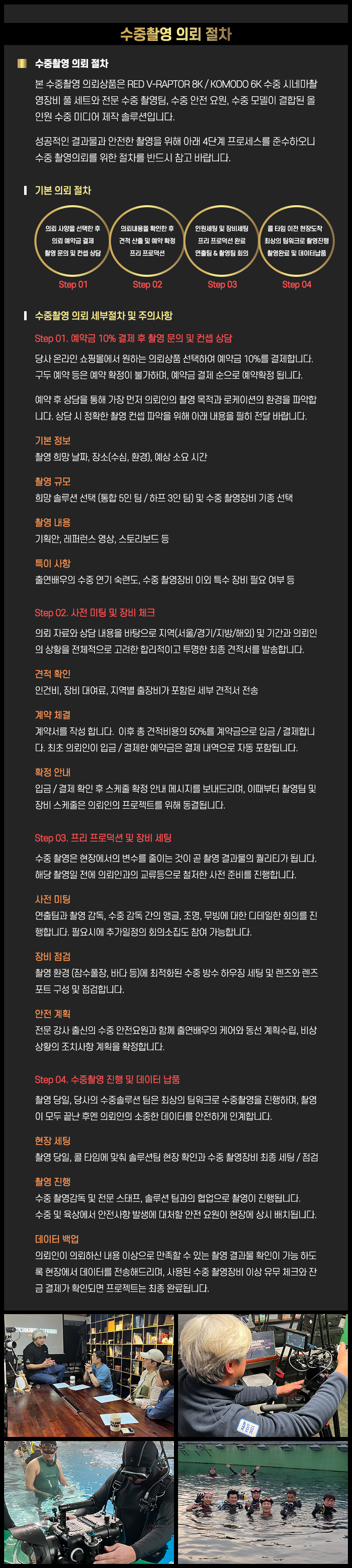경험 많은 수중 전문 미디어 제작팀의 전문성과 안정적인 운용 능력으로 영화, 드라마, 다큐멘터리, 상업 광고, 예술 작품 등 수중 미디어 프로젝트 의뢰에 대하여 어떤 문제없이 최고 수준의 완성도와 전문성으로 차별화된 수중 미디어 콘텐츠 결과물을 제공해드립니다.