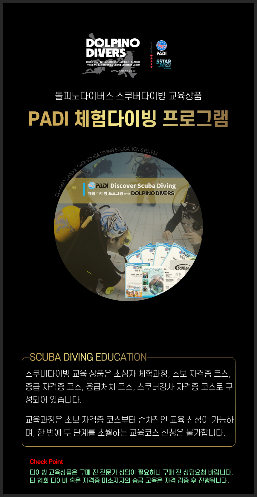 PADI 5 STAR 강사개발센터 돌피노다이버스의 체험다이빙 프로그램에 참여하세요.