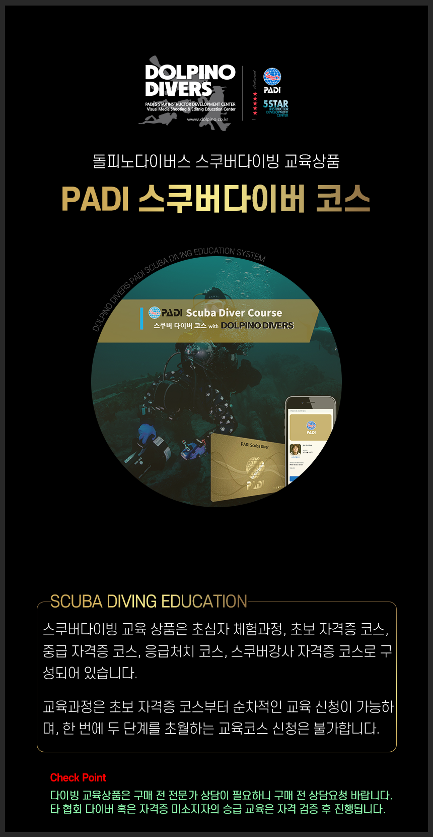 PADI 5 STAR 강사개발센터 돌피노다이버스의 스쿠버다이버 코스에 참여하세요.