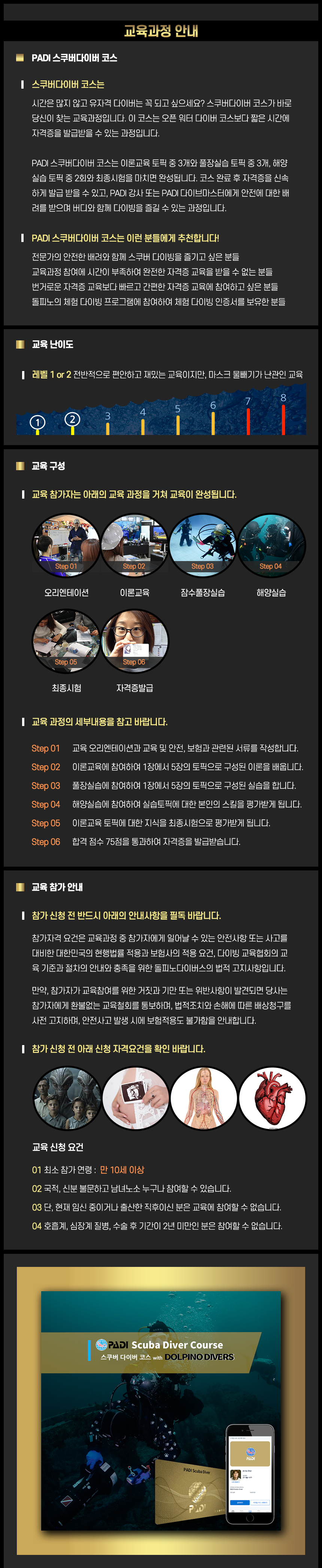 이론교육 토픽 중 3개와 풀장실습 토픽 중 3개, 해양실습 토픽 중 2회와 최종시험을 마치면 완성됩니다.