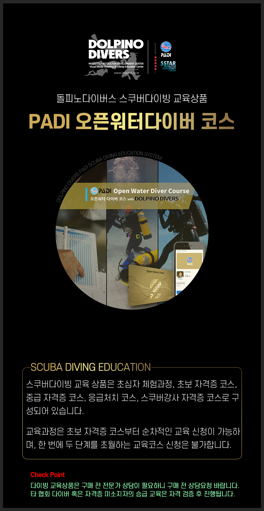 PADI 5 STAR 강사개발센터 돌피노다이버스의 오픈워터다이버 코스에 참여하세요.
